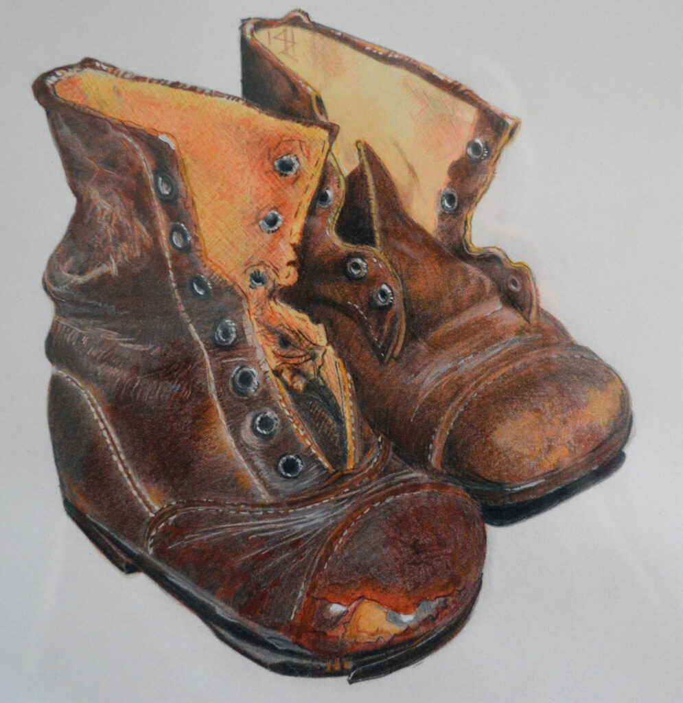 Er stond een flinke voorraad kinderschoentjes en – laarsjes. Linda heeft er twee apart gezet en gefotografeerd en naar die foto heb ik deze tekening gemaakt.