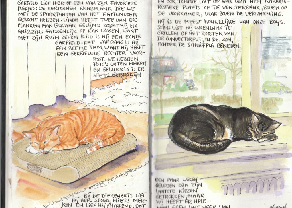 Ik heb een rijtje schetsboekjes, een aantal vol en een paar lege. Af en toe blader ik er weer eens doorheen, wat altijd weer concrete herinneringen oproept. Hieronder een paar bladen uit een van de oude, volledig gevulde bandjes.