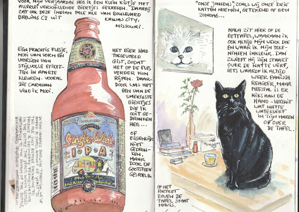 Het IPA-flesje was een mooie verpakking, meer het bier smaakte gewoon vies. Daarachteraan onze drie katers: Nala, Garfield en Tommie (“master Thomas”), die we nog elke dag missen.